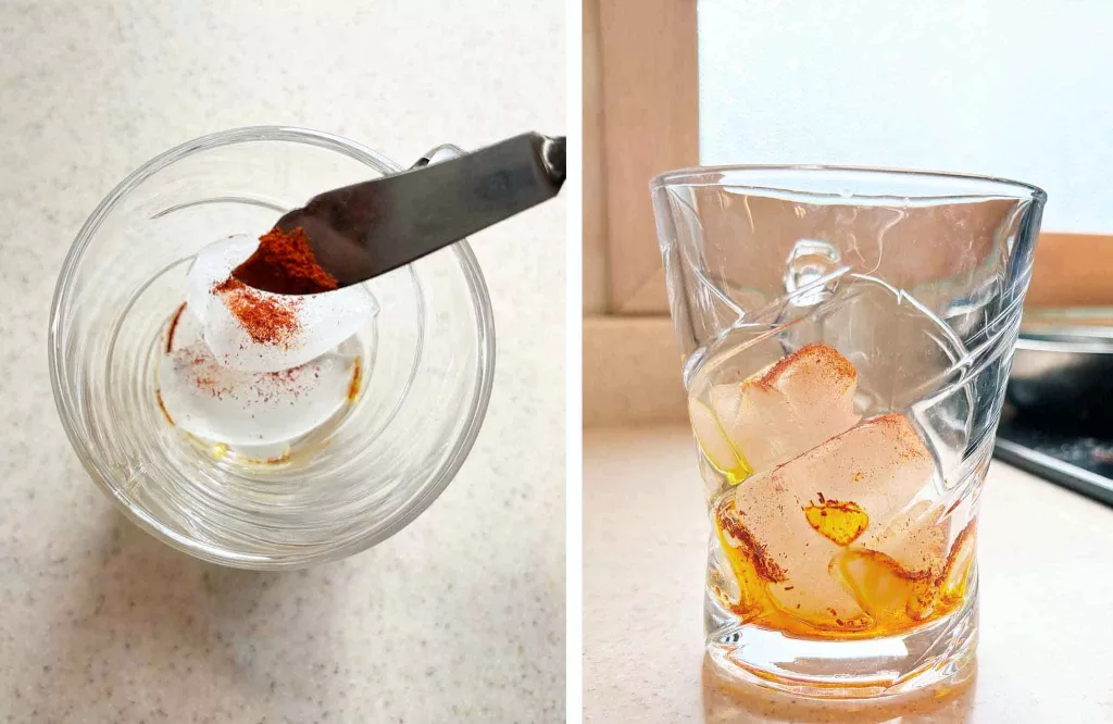 Step 3 – Now, in a glass or jar with ice cubes, sprinkle the saffron powder on top of the cubes and leave it to melt.