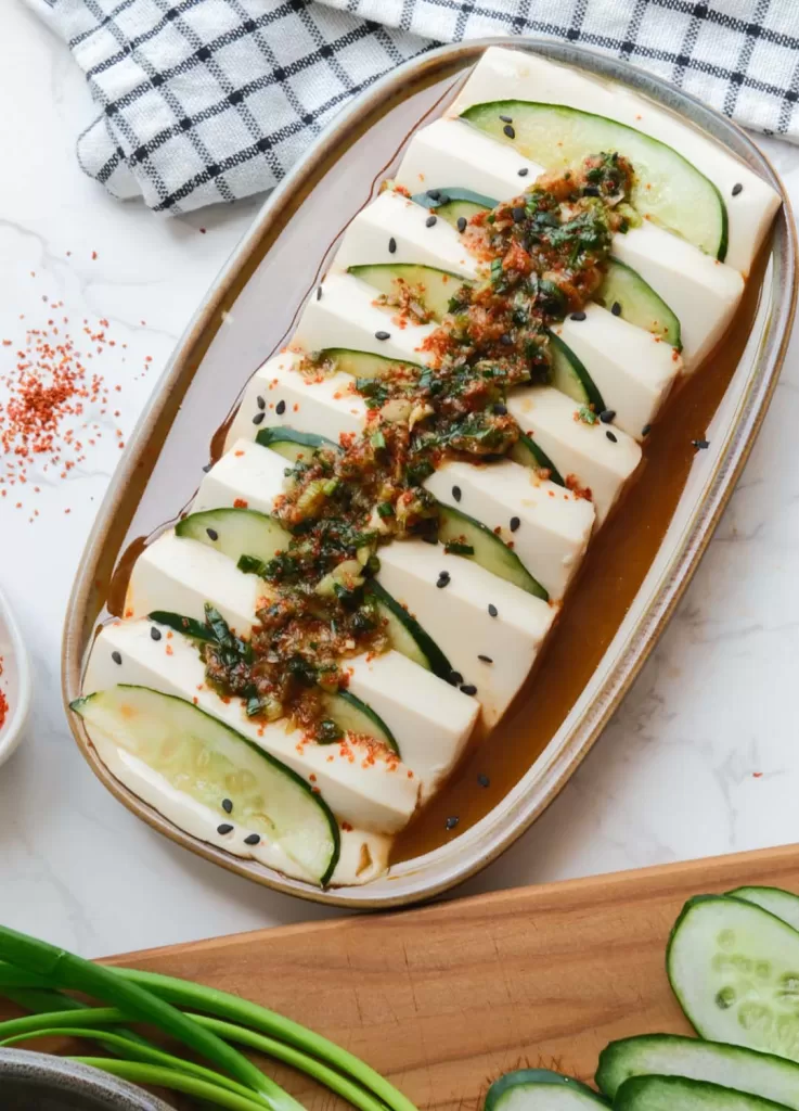 - Bring out the tofu from the steamer and arrange the slices of cucumber in between each slice of the tofu. (Alternatively you can also add the cucumber before steaming, but they won’t be as crisp)