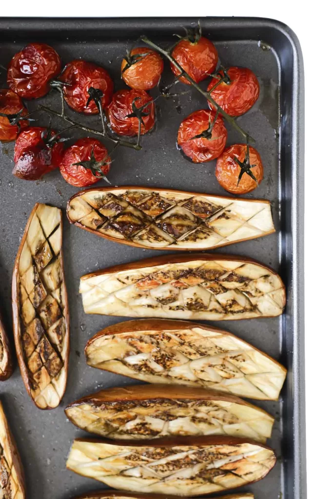 - Transfer the tray to the highest oven rack to roast for 30 minutes or until the eggplant is tender (not completely soft) and golden brown.